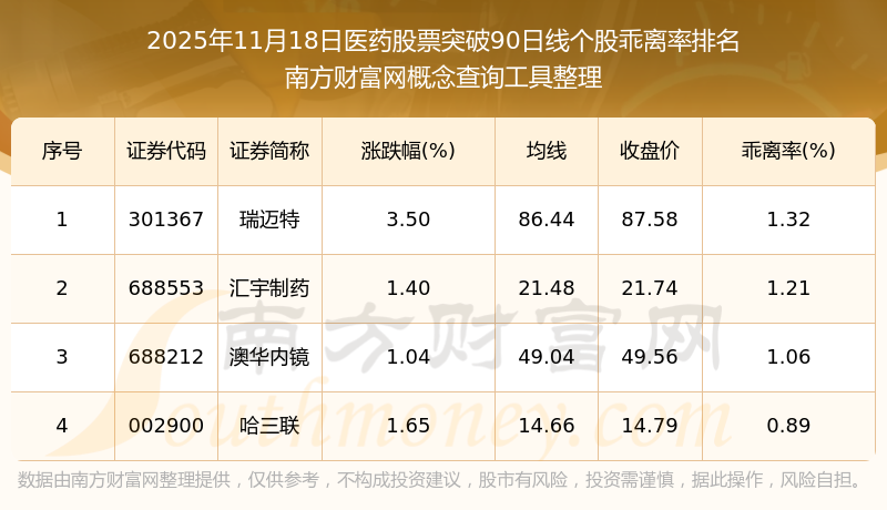 根據(jù)南方財(cái)富網(wǎng)概念查詢工具數(shù)據(jù)統(tǒng)計(jì),截止2025年11月18日收盤,醫(yī)藥股票共有4只個股收盤價向上突破了90日線。其中乖離率較大的個股有瑞邁特、匯宇制藥、澳華內(nèi)鏡等,乖離率分別為1.32%、1.21%、1.06%。
