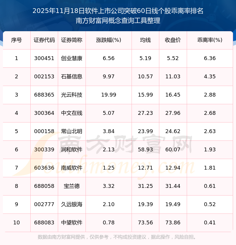 2025年11月18日軟件上市公司突破60日線個股乖離率排名