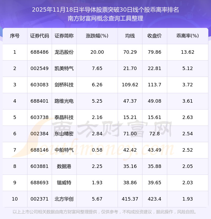 2025年11月18日半導(dǎo)體股票突破30日線個(gè)股乖離率排名