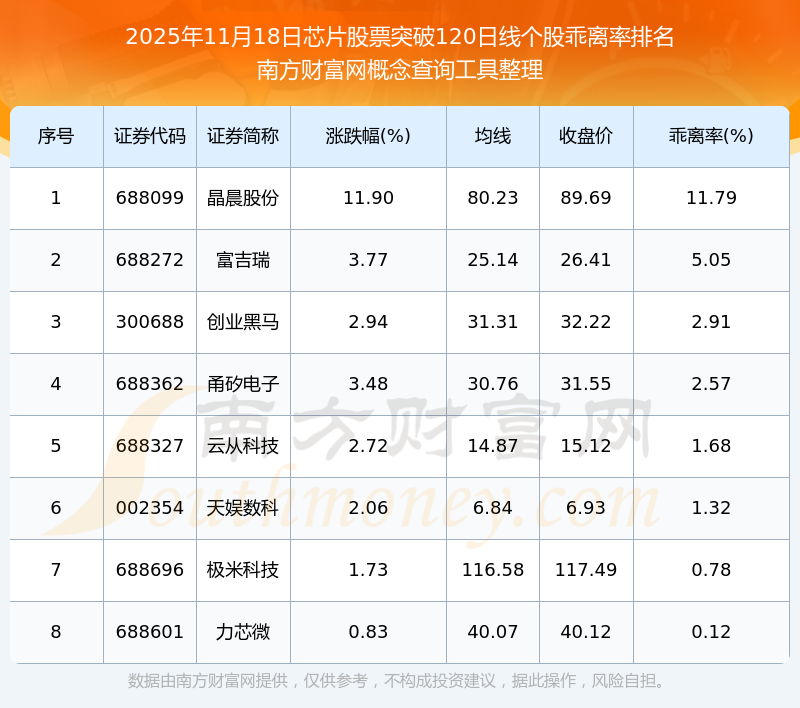 根據(jù)南方財(cái)富網(wǎng)概念查詢工具數(shù)據(jù)統(tǒng)計(jì),截止2025年11月18日收盤,芯片股票共有8只個(gè)股收盤價(jià)向上突破了120日線。其中乖離率較大的個(gè)股有晶晨股份、富吉瑞、創(chuàng)業(yè)黑馬等,乖離率分別為11.79%、5.05%、2.91%。