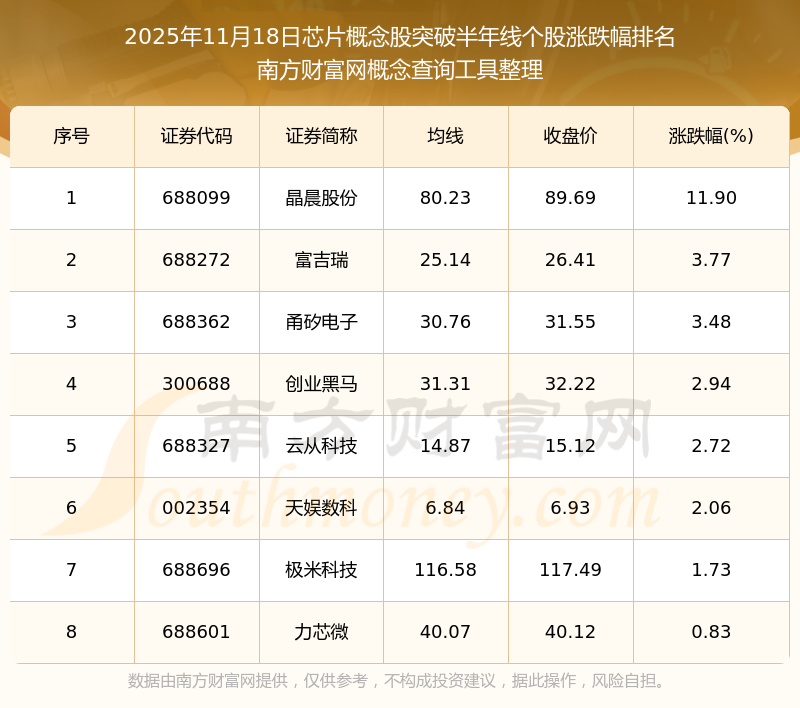 根據(jù)南方財(cái)富網(wǎng)概念查詢工具數(shù)據(jù)統(tǒng)計(jì),截止2025年11月18日收盤,芯片概念股共有8只個(gè)股收盤價(jià)向上突破了半年線。其中漲幅較大的個(gè)股有晶晨股份、富吉瑞、甬矽電子等,漲幅分別為11.90%、3.77%、3.48%。