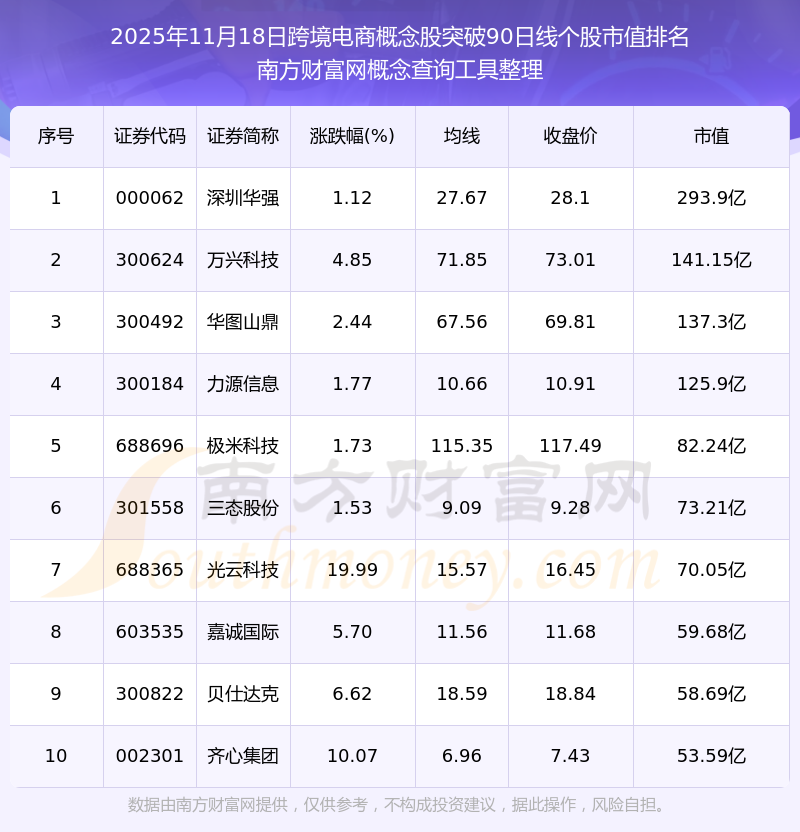 根據(jù)南方財富網概念查詢工具數(shù)據(jù)統(tǒng)計,截止2025年11月18日收盤,跨境電商概念股共有14只個股收盤價向上突破了90日線。其中市值較大的個股有深圳華強、萬興科技、華圖山鼎等,市值分別為293.9億、141.15億、137.3億。
