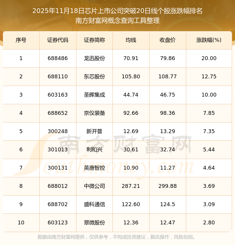 根據(jù)南方財富網(wǎng)概念查詢工具數(shù)據(jù)統(tǒng)計,截止2025年11月18日收盤,芯片上市公司共有24只個股收盤價向上突破了20日線。其中漲幅較大的個股有龍迅股份、東芯股份、圣暉集成等,漲幅分別為20.00%、12.75%、10.00%。
