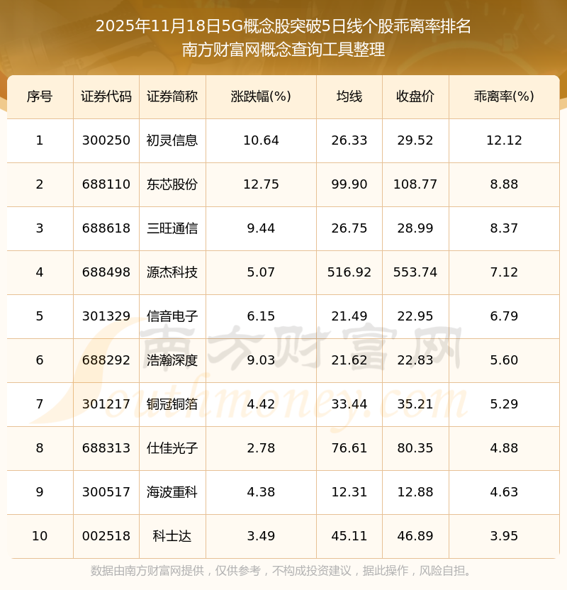 根據(jù)南方財(cái)富網(wǎng)概念查詢工具數(shù)據(jù)統(tǒng)計(jì),截止2025年11月18日收盤,5G概念股共有36只個(gè)股收盤價(jià)向上突破了5日線。其中乖離率較大的個(gè)股有初靈信息、東芯股份、三旺通信等,乖離率分別為12.12%、8.88%、8.37%。