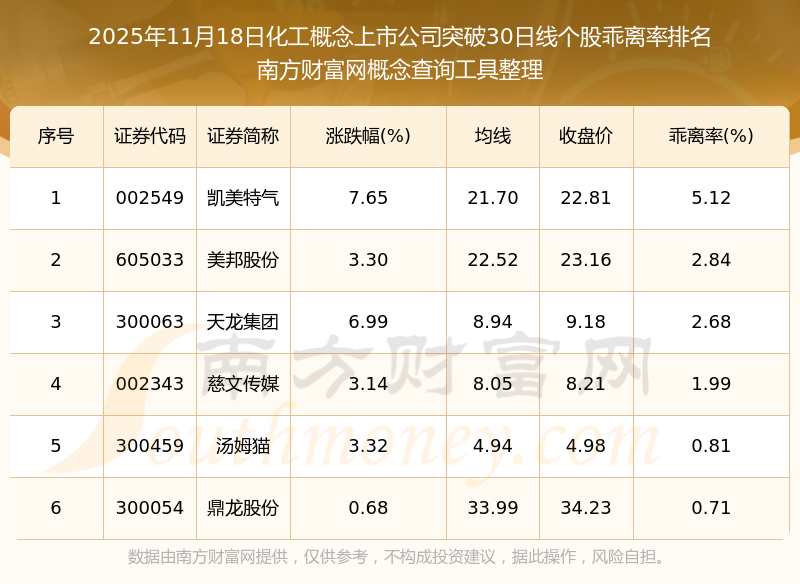 根據南方財富網概念查詢工具數據統(tǒng)計,截止2025年11月18日收盤,化工概念上市公司共有6只個股收盤價向上突破了30日線。其中乖離率較大的個股有凱美特氣、美邦股份、天龍集團等,乖離率分別為5.12%、2.84%、2.68%。