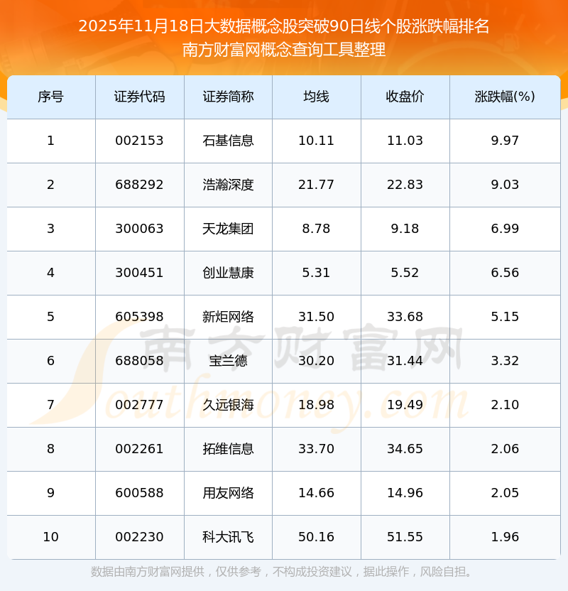 根據(jù)南方財(cái)富網(wǎng)概念查詢工具數(shù)據(jù)統(tǒng)計(jì),截止2025年11月18日收盤,大數(shù)據(jù)概念股共有14只個(gè)股收盤價(jià)向上突破了90日線。其中漲幅較大的個(gè)股有石基信息、浩瀚深度、天龍集團(tuán)等,漲幅分別為9.97%、9.03%、6.99%。