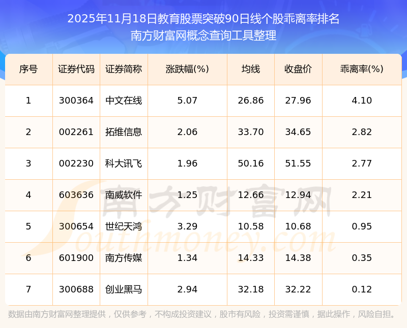 根據(jù)南方財富網(wǎng)概念查詢工具數(shù)據(jù)統(tǒng)計,截止2025年11月18日收盤,教育股票共有7只個股收盤價向上突破了90日線。其中乖離率較大的個股有中文在線、拓維信息、科大訊飛等,乖離率分別為4.10%、2.82%、2.77%。
