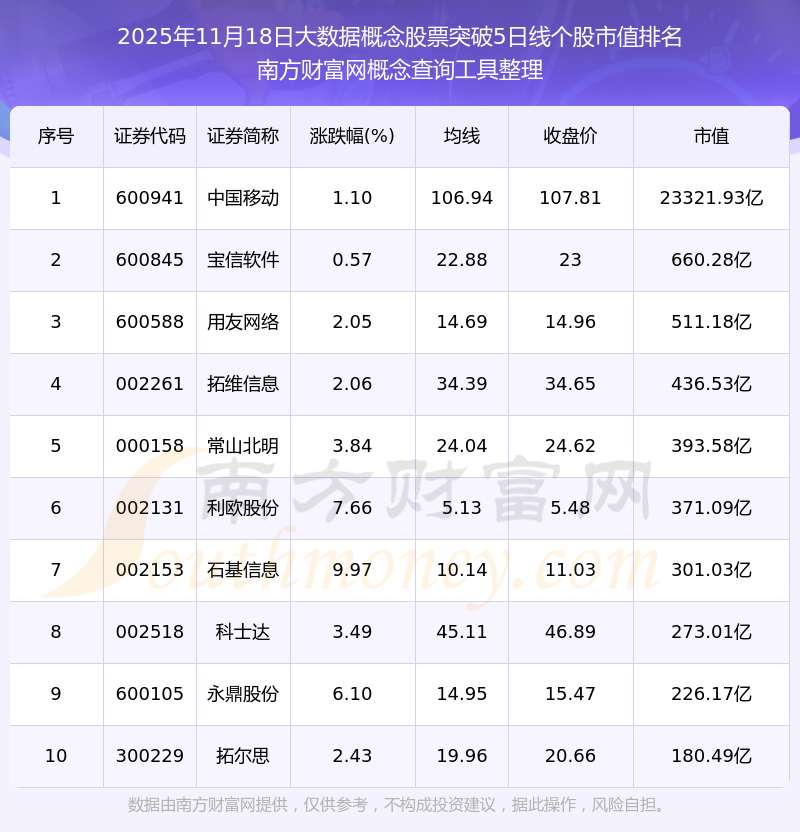 2025年11月18日大數(shù)據(jù)概念股票突破5日線個(gè)股市值排名