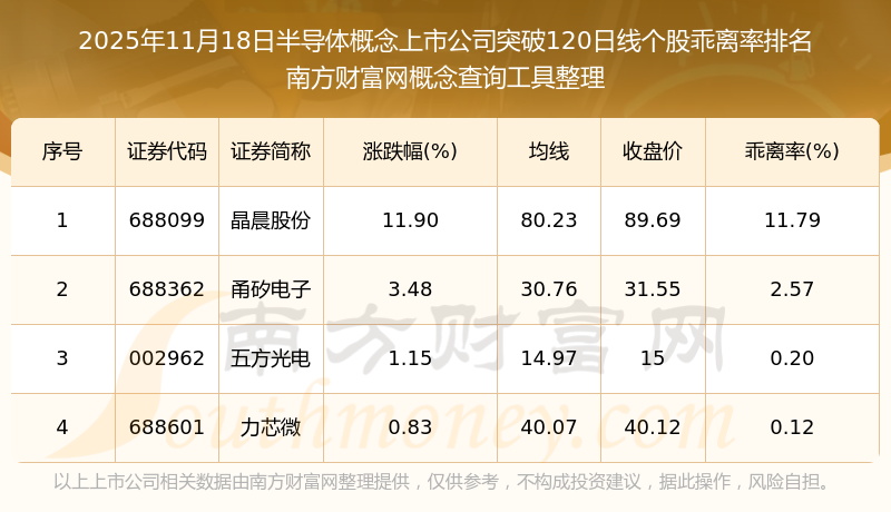根據(jù)南方財富網(wǎng)概念查詢工具數(shù)據(jù)統(tǒng)計,截止2025年11月18日收盤,半導體概念上市公司共有4只個股收盤價向上突破了120日線。其中乖離率較大的個股有晶晨股份、甬矽電子、五方光電等,乖離率分別為11.79%、2.57%、0.20%。