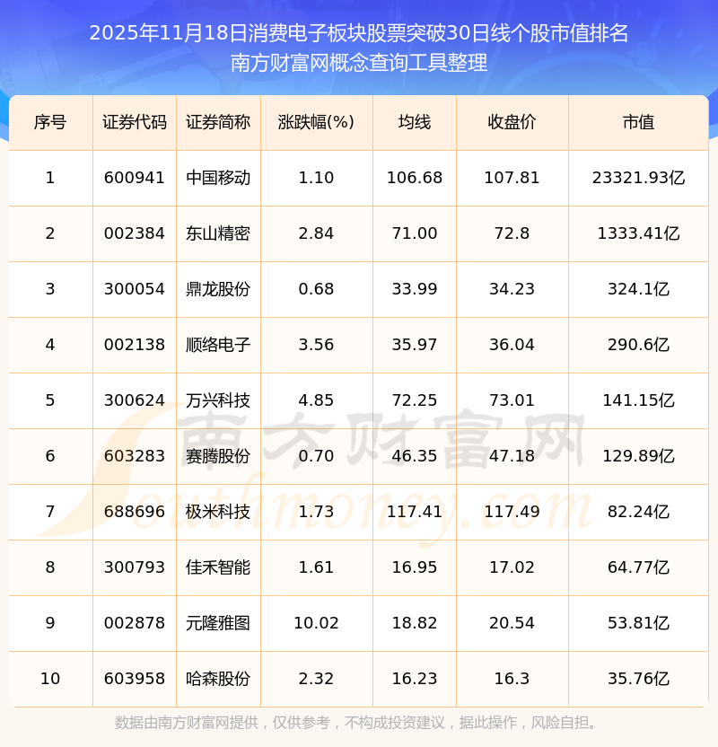 根據(jù)南方財(cái)富網(wǎng)概念查詢工具數(shù)據(jù)統(tǒng)計(jì),截止2025年11月18日收盤,消費(fèi)電子板塊股票共有10只個(gè)股收盤價(jià)向上突破了30日線。其中市值較大的個(gè)股有中國移動(dòng)、東山精密、鼎龍股份等,市值分別為23321.93億、1333.41億、324.1億。