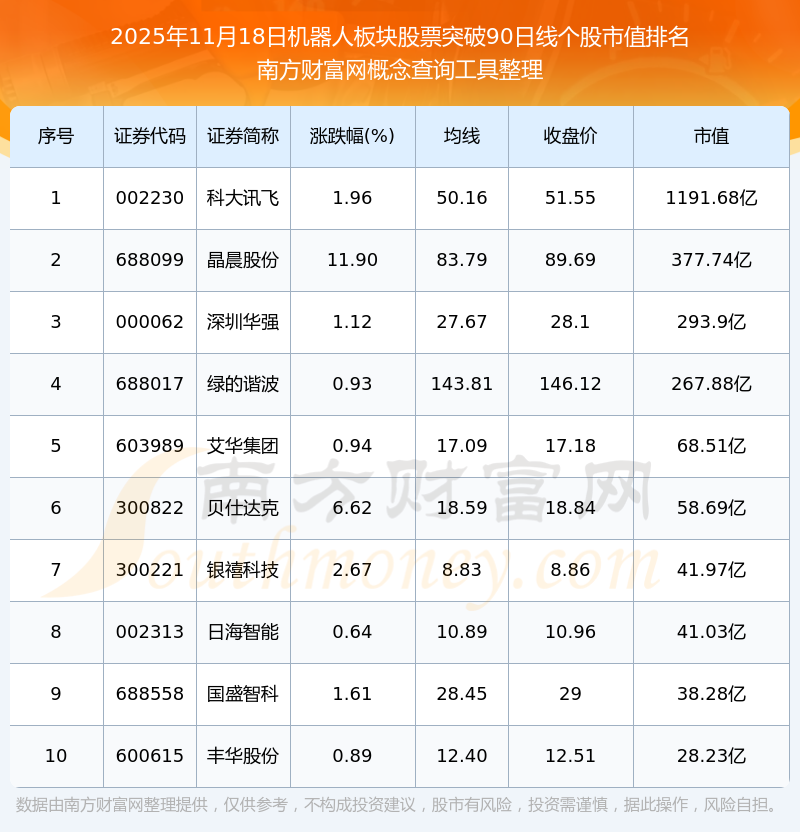 根據(jù)南方財(cái)富網(wǎng)概念查詢(xún)工具數(shù)據(jù)統(tǒng)計(jì),截止2025年11月18日收盤(pán),機(jī)器人板塊股票共有11只個(gè)股收盤(pán)價(jià)向上突破了90日線(xiàn)。其中市值較大的個(gè)股有科大訊飛、晶晨股份、深圳華強(qiáng)等,市值分別為1191.68億、377.74億、293.9億。