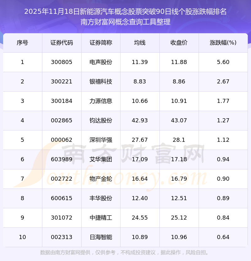 根據(jù)南方財富網(wǎng)概念查詢工具數(shù)據(jù)統(tǒng)計,截止2025年11月18日收盤,新能源汽車概念股票共有10只個股收盤價向上突破了90日線。其中漲幅較大的個股有電聲股份、銀禧科技、力源信息等,漲幅分別為5.60%、2.67%、1.77%。