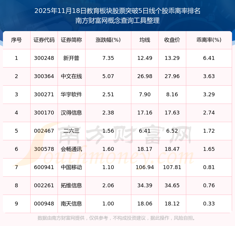 2025年11月18日教育板塊股票突破5日線個(gè)股乖離率排名