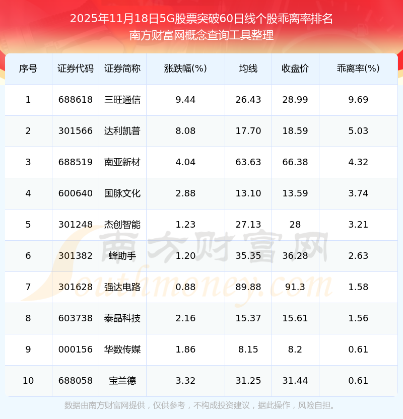 根據(jù)南方財富網(wǎng)概念查詢工具數(shù)據(jù)統(tǒng)計,截止2025年11月18日收盤,5G股票共有14只個股收盤價向上突破了60日線。其中乖離率較大的個股有三旺通信、達(dá)利凱普、南亞新材等,乖離率分別為9.69%、5.03%、4.32%。