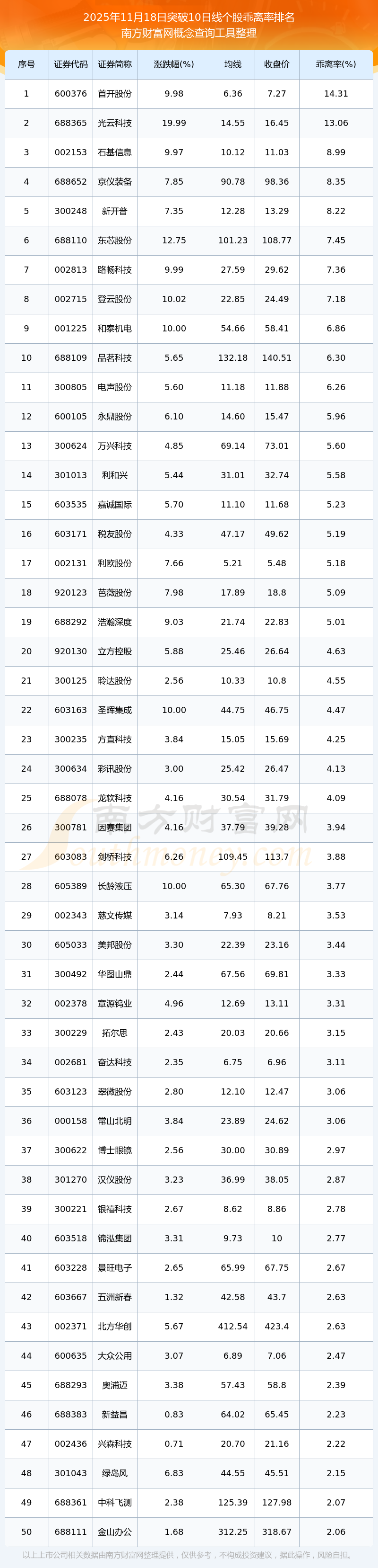 根據(jù)南方財富網(wǎng)概念查詢工具數(shù)據(jù)統(tǒng)計,截止2025年11月18日收盤,共有122只個股收盤價向上突破了10日線,其中乖離率較大的個股有首開股份、光云科技、石基信息、京儀裝備、新開普等,乖離率分別為14.31%、13.06%、8.99%、8.35%、8.22%。
