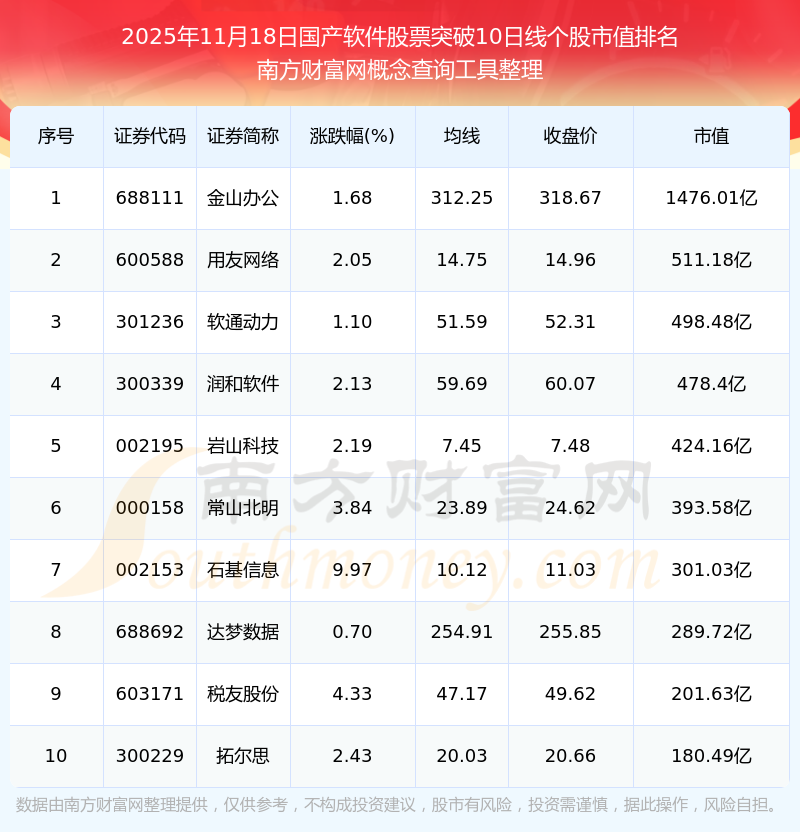 2025年11月18日國產軟件股票突破10日線個股市值排名