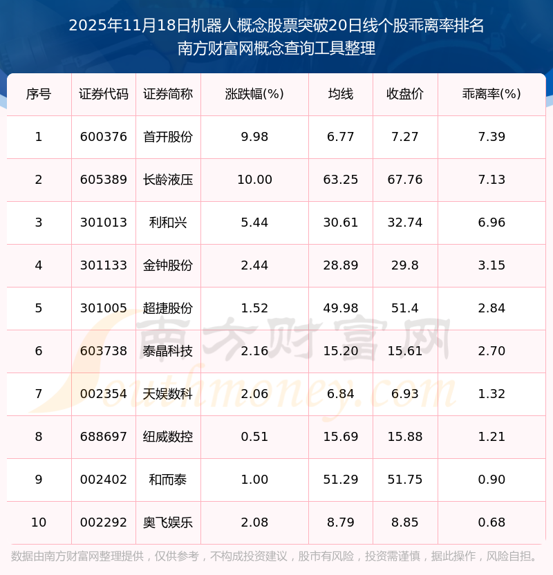 根據(jù)南方財富網(wǎng)概念查詢工具數(shù)據(jù)統(tǒng)計,截止2025年11月18日收盤,機器人概念股票共有12只個股收盤價向上突破了20日線。其中乖離率較大的個股有首開股份、長齡液壓、利和興等,乖離率分別為7.39%、7.13%、6.96%。