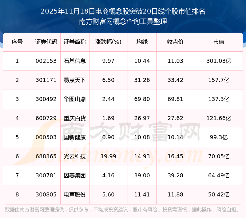 根據(jù)南方財富網(wǎng)概念查詢工具數(shù)據(jù)統(tǒng)計,截止2025年11月18日收盤,電商概念股共有8只個股收盤價向上突破了20日線。其中市值較大的個股有石基信息、易點天下、華圖山鼎等,市值分別為301.03億、157.7億、137.3億。