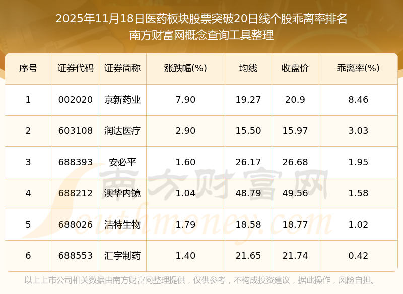 根據(jù)南方財富網(wǎng)概念查詢工具數(shù)據(jù)統(tǒng)計,截止2025年11月18日收盤,醫(yī)藥板塊股票共有6只個股收盤價向上突破了20日線。其中乖離率較大的個股有京新藥業(yè)、潤達醫(yī)療、安必平等,乖離率分別為8.46%、3.03%、1.95%。