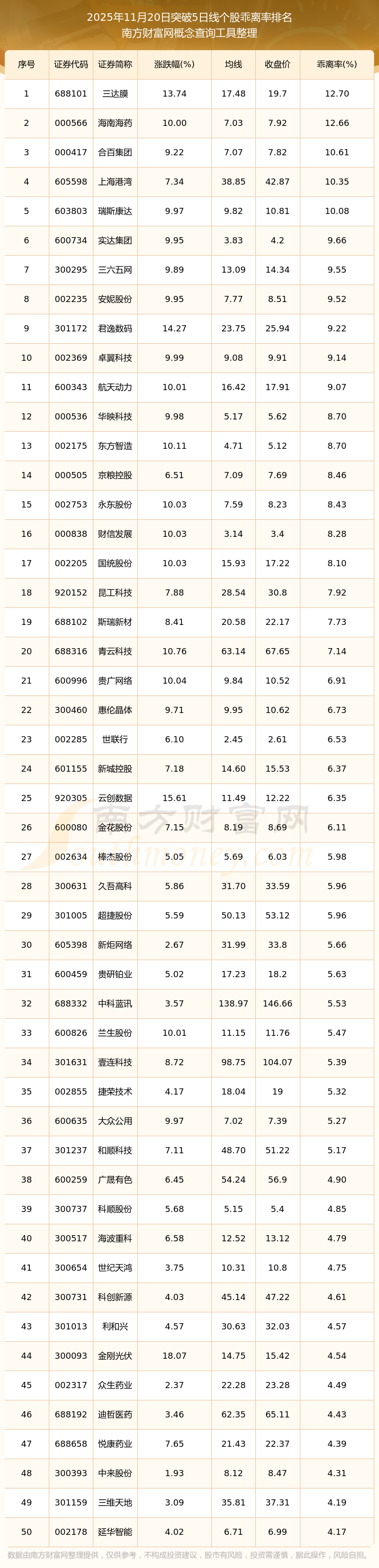 根據(jù)南方財富網(wǎng)概念查詢工具數(shù)據(jù)統(tǒng)計,截止2025年11月20日收盤,共有209只個股收盤價向上突破了5日線,其中乖離率較大的個股有三達膜、海南海藥、合百集團、上海港灣、瑞斯康達等,乖離率分別為12.70%、12.66%、10.61%、10.35%、10.08%。