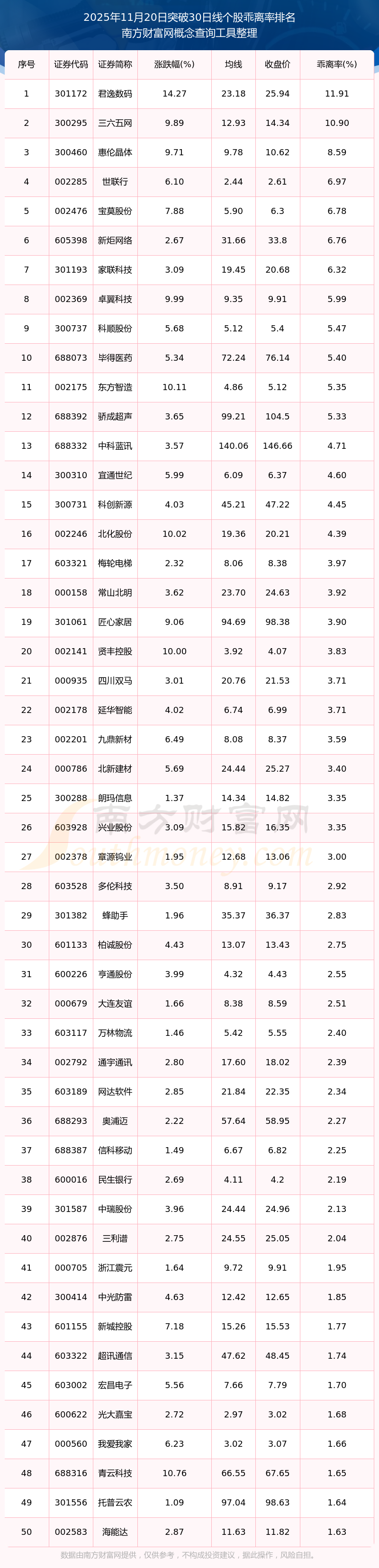 根據(jù)南方財(cái)富網(wǎng)概念查詢工具數(shù)據(jù)統(tǒng)計(jì),截止2025年11月20日收盤,共有88只個股收盤價向上突破了30日線,其中乖離率較大的個股有君逸數(shù)碼、三六五網(wǎng)、惠倫晶體、世聯(lián)行、寶莫股份等,乖離率分別為11.91%、10.90%、8.59%、6.97%、6.78%。
