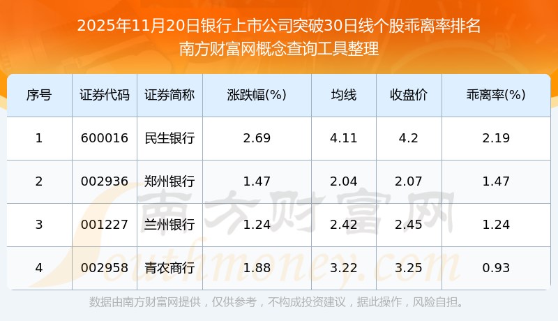2025年11月20日銀行上市公司突破30日線個(gè)股乖離率排名