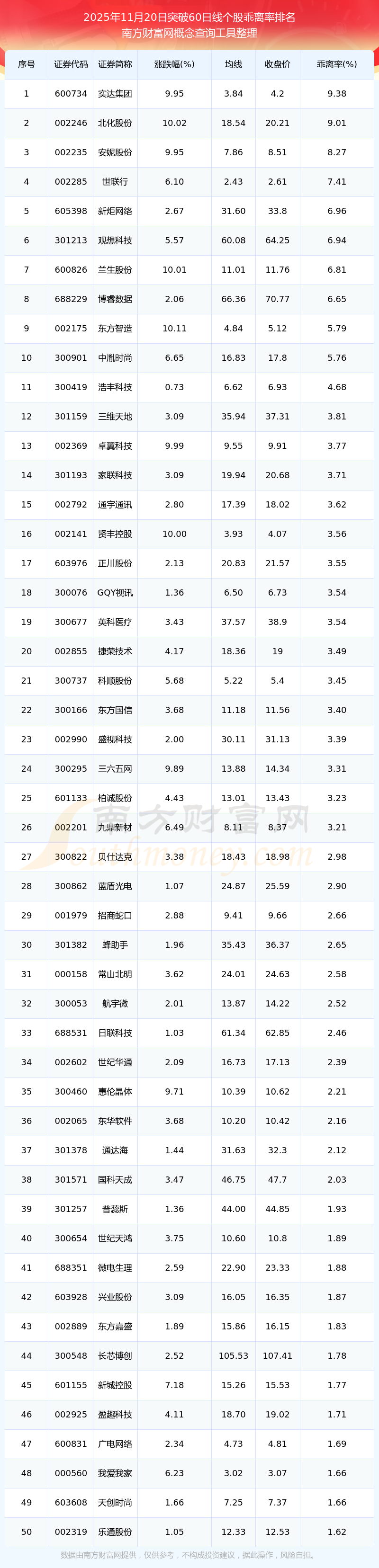 2025年11月20日突破60日線個(gè)股乖離率排名