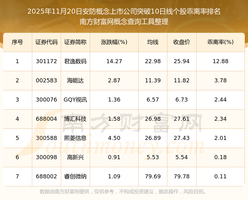 根據南方財富網概念查詢工具數據統(tǒng)計,截止2025年11月20日收盤,安防概念上市公司共有7只個股收盤價向上突破了10日線。其中乖離率較大的個股有君逸數碼、海能達、GQY視訊等,乖離率分別為12.88%、3.78%、2.44%。