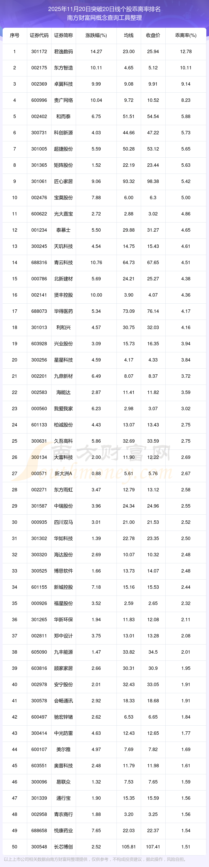 2025年11月20日突破20日線個(gè)股乖離率排名