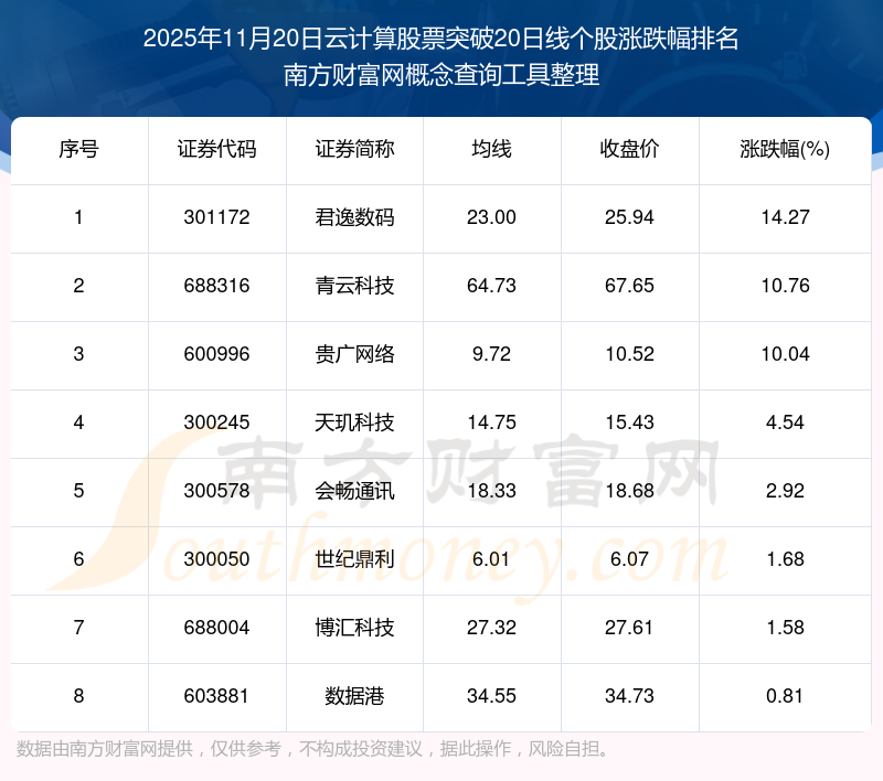 2025年11月20日云計(jì)算股票突破20日線個(gè)股漲跌幅排名