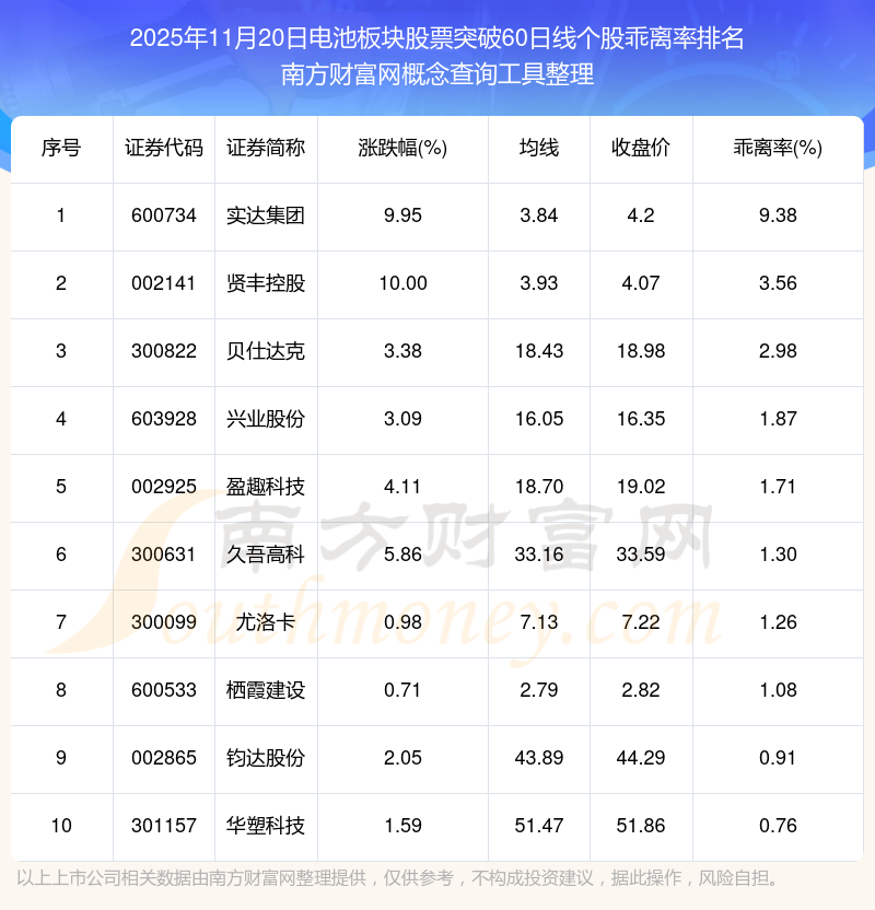 2025年11月20日電池板塊股票突破60日線個(gè)股乖離率排名