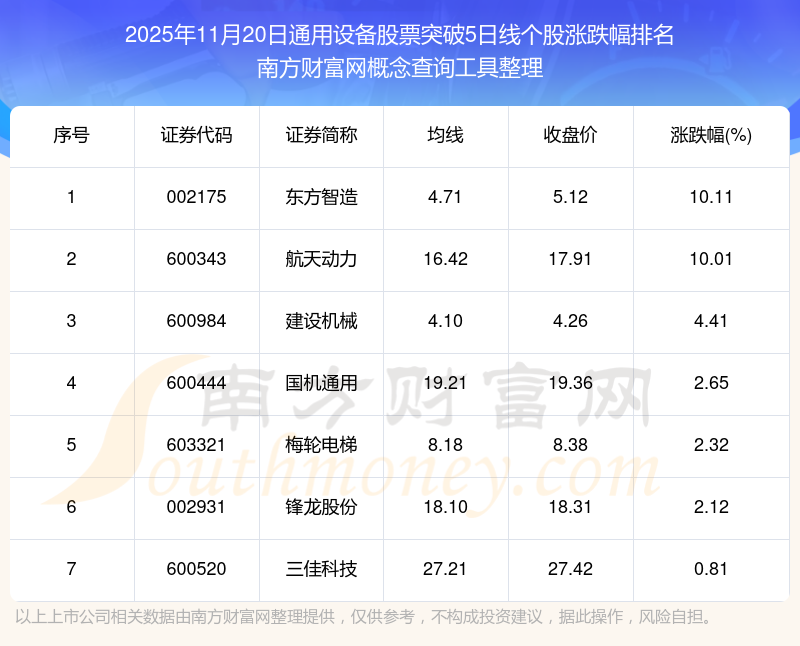 根據(jù)南方財(cái)富網(wǎng)概念查詢工具數(shù)據(jù)統(tǒng)計(jì),截止2025年11月20日收盤,通用設(shè)備股票共有7只個(gè)股收盤價(jià)向上突破了5日線。其中漲幅較大的個(gè)股有東方智造、航天動(dòng)力、建設(shè)機(jī)械等,漲幅分別為10.11%、10.01%、4.41%。