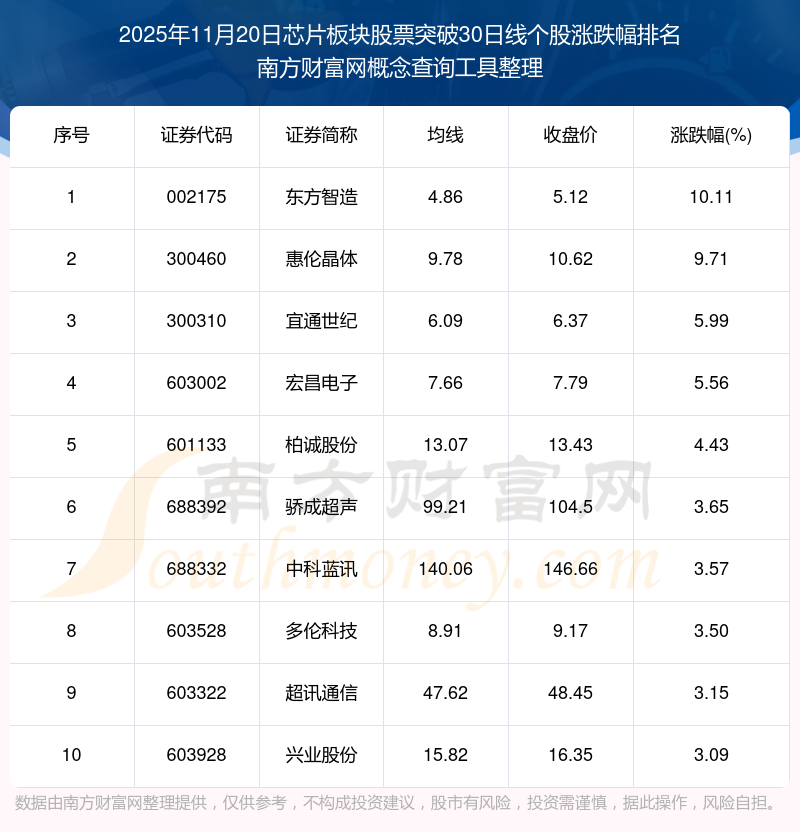 2025年11月20日芯片板塊股票突破30日線個(gè)股漲跌幅排名