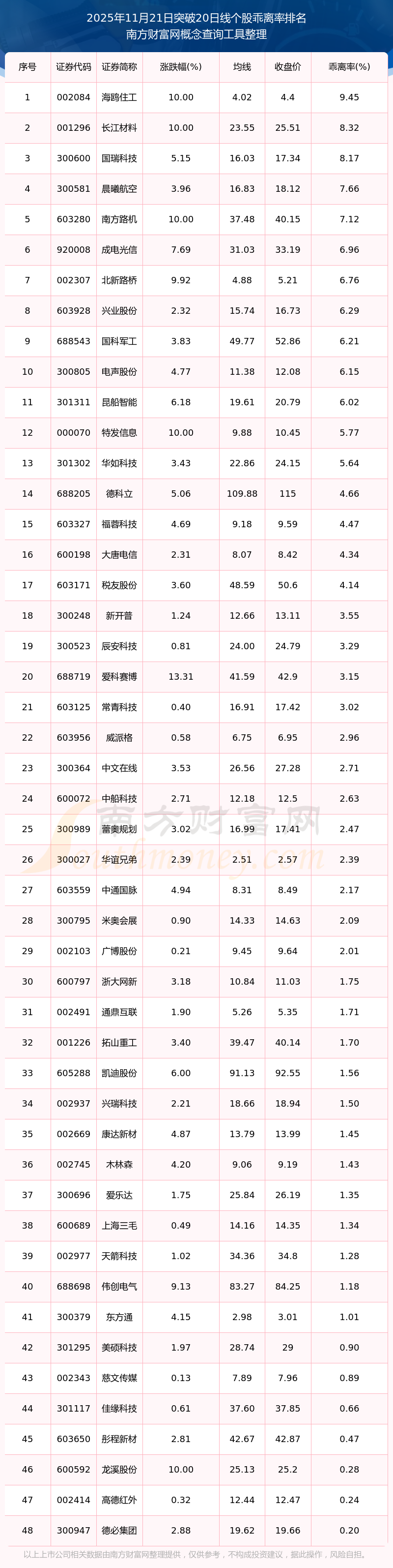根據(jù)南方財富網(wǎng)概念查詢工具數(shù)據(jù)統(tǒng)計,截止2025年11月21日收盤,共有48只個股收盤價向上突破了20日線,其中乖離率較大的個股有海鷗住工、長江材料、國瑞科技、晨曦航空、南方路機等,乖離率分別為9.45%、8.32%、8.17%、7.66%、7.12%。