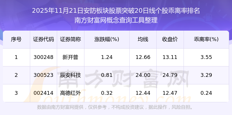 2025年11月21日安防板塊股票突破20日線個(gè)股乖離率排名