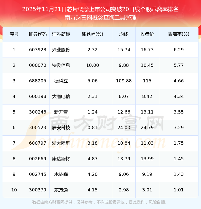 根據(jù)南方財(cái)富網(wǎng)概念查詢工具數(shù)據(jù)統(tǒng)計(jì),截止2025年11月21日收盤,芯片概念上市公司共有13只個(gè)股收盤價(jià)向上突破了20日線。其中乖離率較大的個(gè)股有興業(yè)股份、特發(fā)信息、德科立等,乖離率分別為6.29%、5.77%、4.66%。