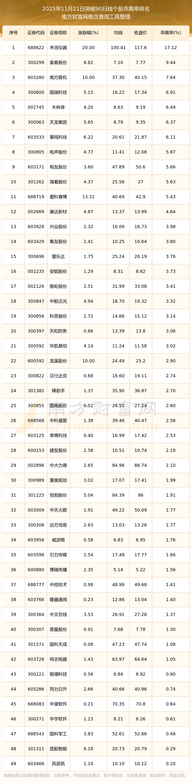 根據(jù)南方財(cái)富網(wǎng)概念查詢工具數(shù)據(jù)統(tǒng)計(jì),截止2025年11月21日收盤,共有49只個(gè)股收盤價(jià)向上突破了90日線,其中乖離率較大的個(gè)股有禾信儀器、富春股份、南方路機(jī)、國瑞科技、木林森等,乖離率分別為17.12%、9.44%、7.64%、6.91%、6.49%。