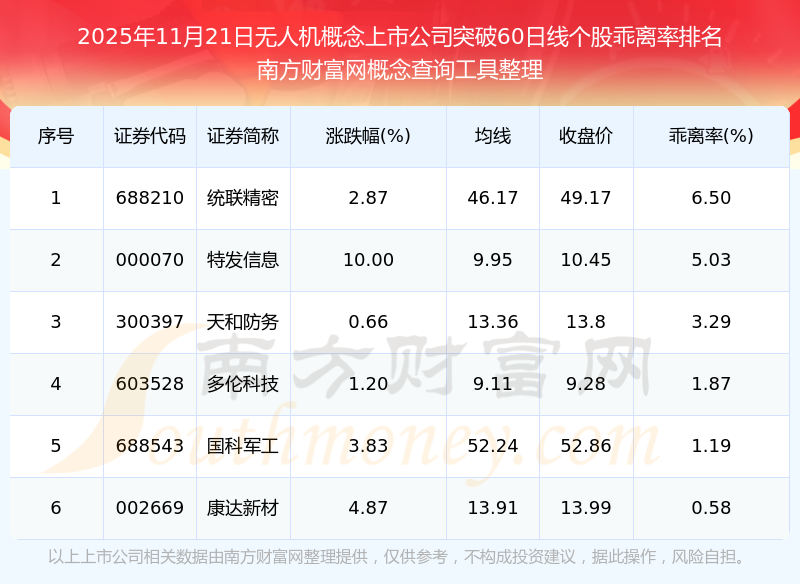 2025年11月21日無(wú)人機(jī)概念上市公司突破60日線(xiàn)個(gè)股乖離率排名