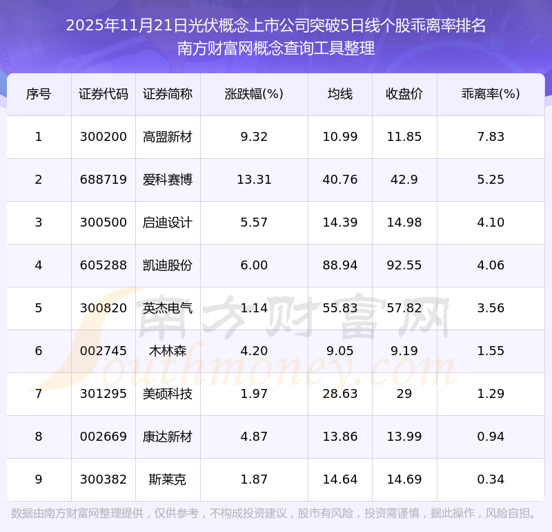 2025年11月21日光伏概念上市公司突破5日線個股乖離率排名