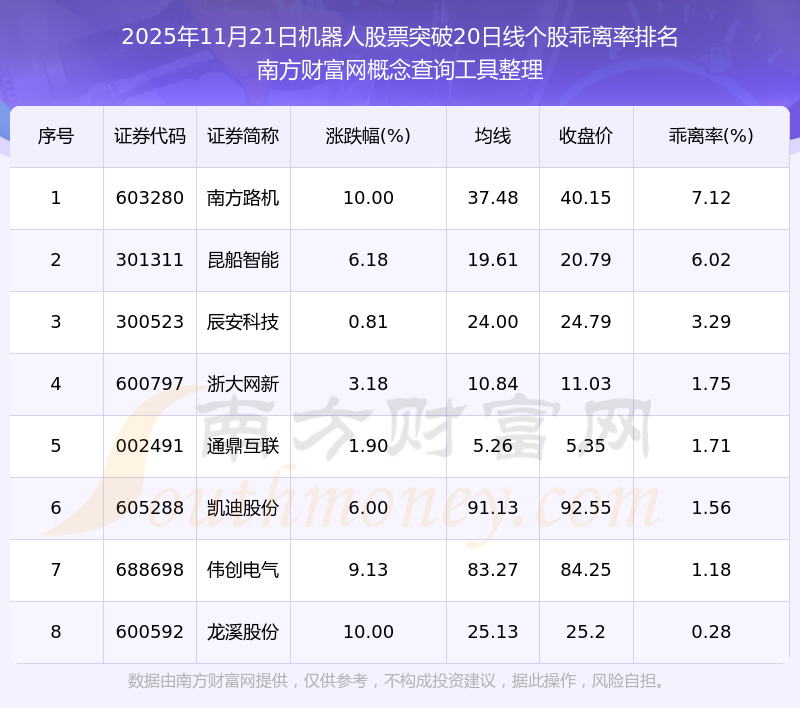 根據(jù)南方財富網(wǎng)概念查詢工具數(shù)據(jù)統(tǒng)計,截止2025年11月21日收盤,機器人股票共有8只個股收盤價向上突破了20日線。其中乖離率較大的個股有南方路機、昆船智能、辰安科技等,乖離率分別為7.12%、6.02%、3.29%。