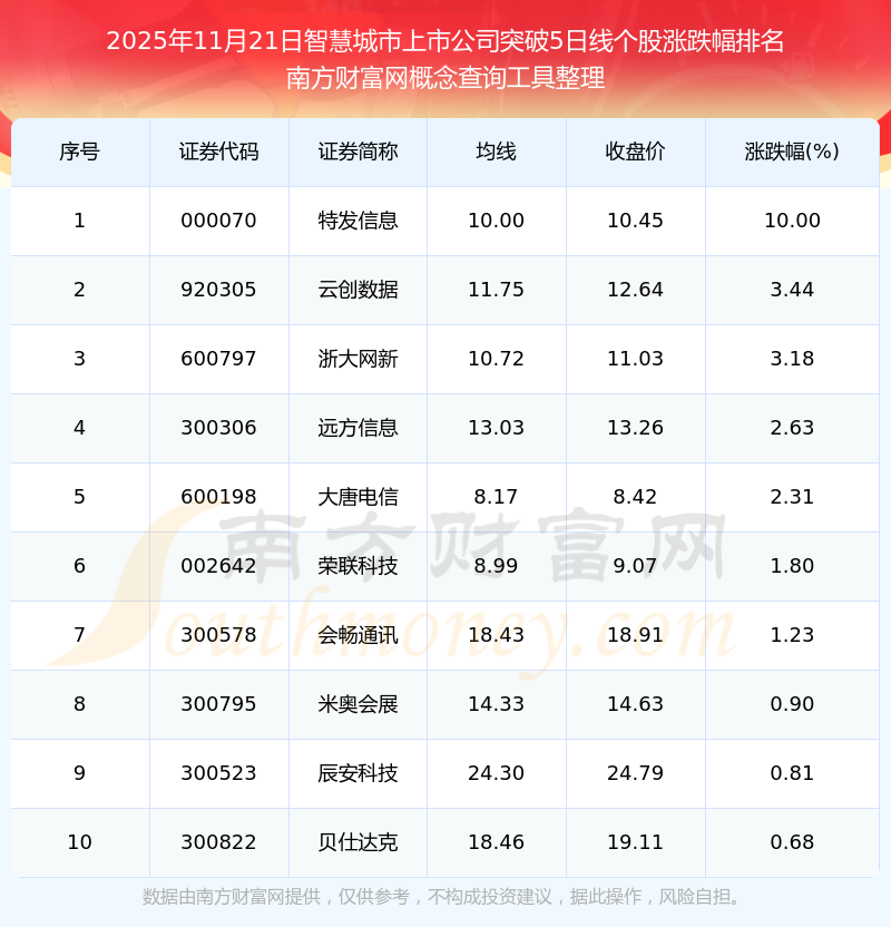 根據(jù)南方財富網(wǎng)概念查詢工具數(shù)據(jù)統(tǒng)計,截止2025年11月21日收盤,智慧城市上市公司共有10只個股收盤價向上突破了5日線。其中漲幅較大的個股有特發(fā)信息、云創(chuàng)數(shù)據(jù)、浙大網(wǎng)新等,漲幅分別為10.00%、3.44%、3.18%。