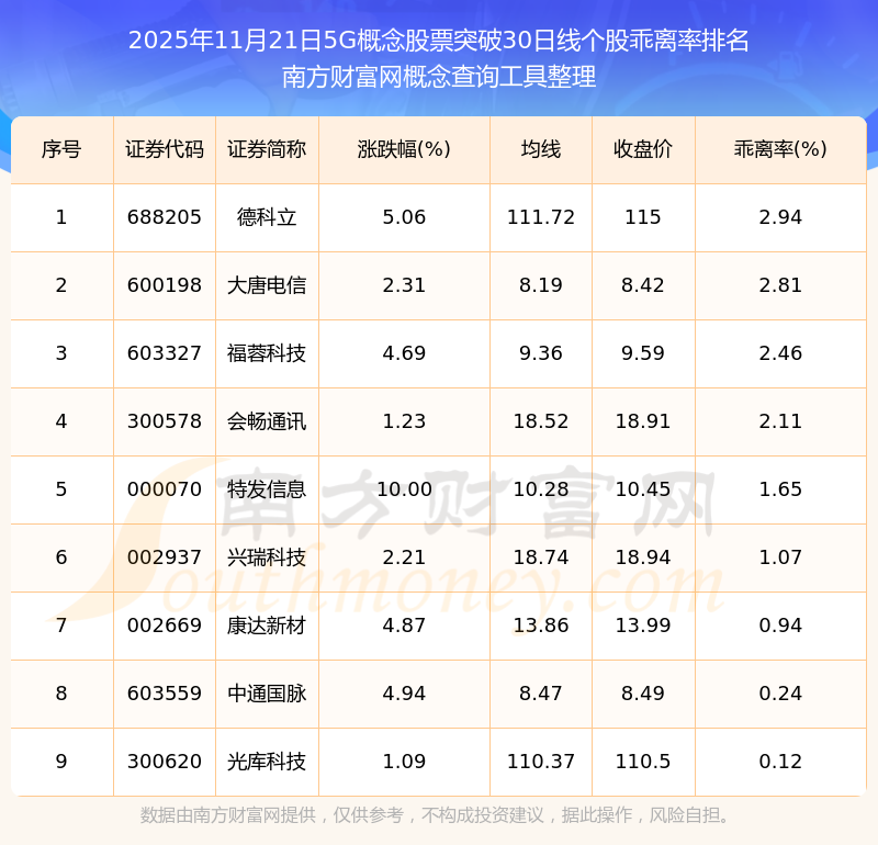 根據(jù)南方財富網(wǎng)概念查詢工具數(shù)據(jù)統(tǒng)計,截止2025年11月21日收盤,5G概念股票共有9只個股收盤價向上突破了30日線。其中乖離率較大的個股有德科立、大唐電信、福蓉科技等,乖離率分別為2.94%、2.81%、2.46%。