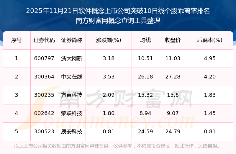 2025年11月21日軟件概念上市公司突破10日線個股乖離率排名