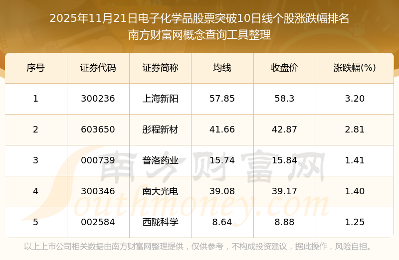 2025年11月21日電子化學(xué)品股票突破10日線個(gè)股漲跌幅排名