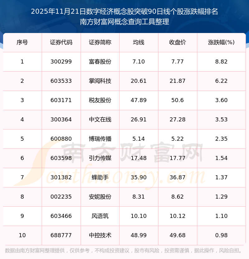根據(jù)南方財(cái)富網(wǎng)概念查詢工具數(shù)據(jù)統(tǒng)計(jì),截止2025年11月21日收盤,數(shù)字經(jīng)濟(jì)概念股共有10只個(gè)股收盤價(jià)向上突破了90日線。其中漲幅較大的個(gè)股有富春股份、掌閱科技、稅友股份等,漲幅分別為8.82%、6.22%、3.60%。