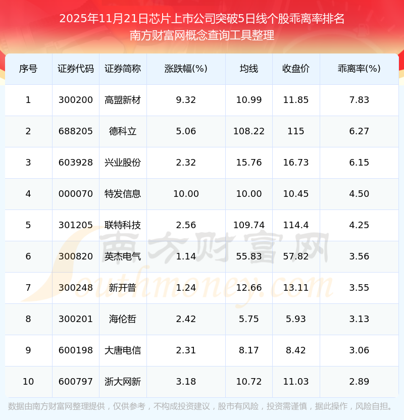 根據(jù)南方財(cái)富網(wǎng)概念查詢工具數(shù)據(jù)統(tǒng)計(jì),截止2025年11月21日收盤,芯片上市公司共有19只個股收盤價向上突破了5日線。其中乖離率較大的個股有高盟新材、德科立、興業(yè)股份等,乖離率分別為7.83%、6.27%、6.15%。