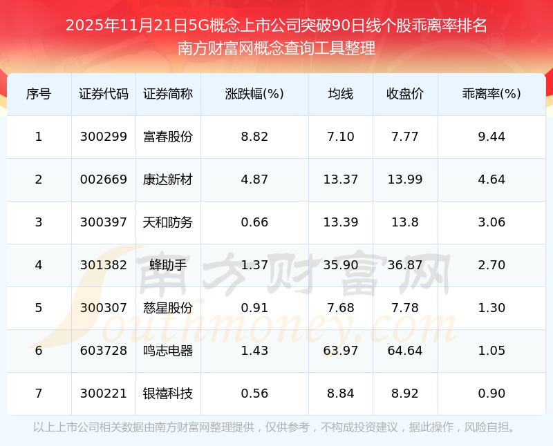 根據(jù)南方財富網(wǎng)概念查詢工具數(shù)據(jù)統(tǒng)計,截止2025年11月21日收盤,5G概念上市公司共有7只個股收盤價向上突破了90日線。其中乖離率較大的個股有富春股份、康達新材、天和防務等,乖離率分別為9.44%、4.64%、3.06%。