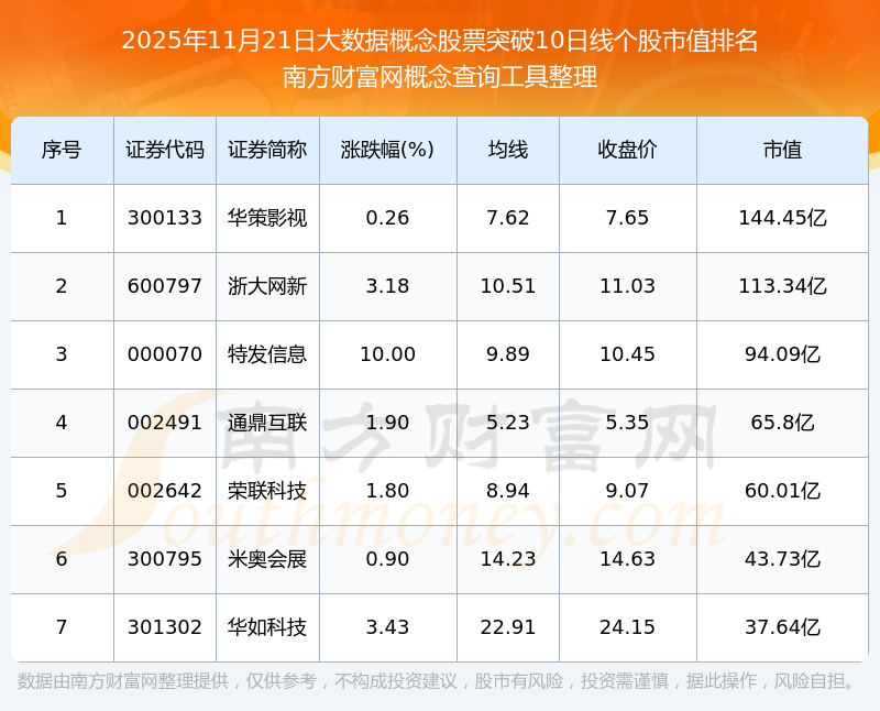 2025年11月21日大數(shù)據(jù)概念股票突破10日線個(gè)股市值排名