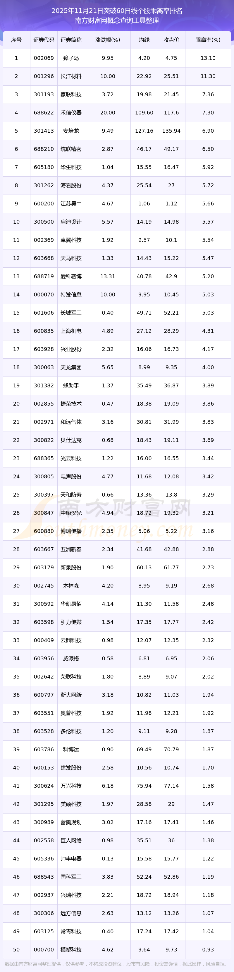 根據(jù)南方財富網(wǎng)概念查詢工具數(shù)據(jù)統(tǒng)計,截止2025年11月21日收盤,共有59只個股收盤價向上突破了60日線,其中乖離率較大的個股有獐子島、長江材料、家聯(lián)科技、禾信儀器、安培龍等,乖離率分別為13.10%、11.30%、7.36%、7.30%、6.90%。