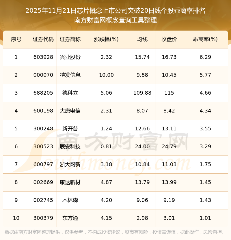 根據(jù)南方財(cái)富網(wǎng)概念查詢工具數(shù)據(jù)統(tǒng)計(jì),截止2025年11月21日收盤,芯片概念上市公司共有13只個(gè)股收盤價(jià)向上突破了20日線。其中乖離率較大的個(gè)股有興業(yè)股份、特發(fā)信息、德科立等,乖離率分別為6.29%、5.77%、4.66%。